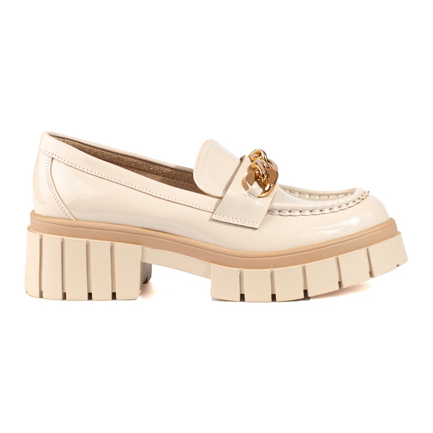 Elegant och modern Loaffe Shelovet i Beige Shade är en kombination av en klassiker med en fashionabla accent. Den släta, lackerade ytan på organisk hud ger skorna en lyxig glöd, medan den gyllene kedjan subtilt betonar naturen på skor och lägger till stil till den både till vardagliga och mer högtidliga stiliseringar.