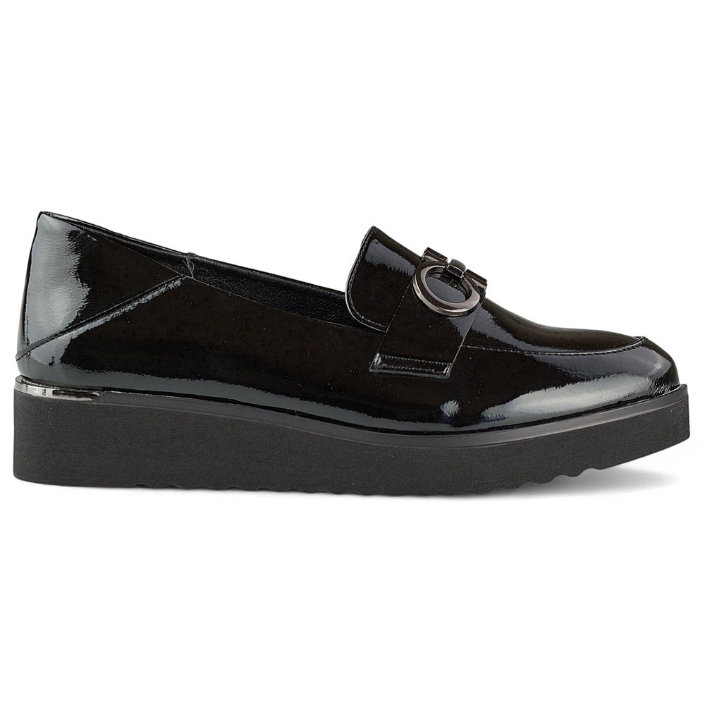 Upptäck elegans och bekvämlighet i en! Lackerade kvinnors skor på en låg kil är ett utmärkt val för kvinnor som vill kombinera stil med komfort. Tillverkade av högkvalitet, lackerat ekologiskt läder i en klassisk svart färg, kommer dessa skor säkert att fånga ögat och lägga till stil till alla styling.