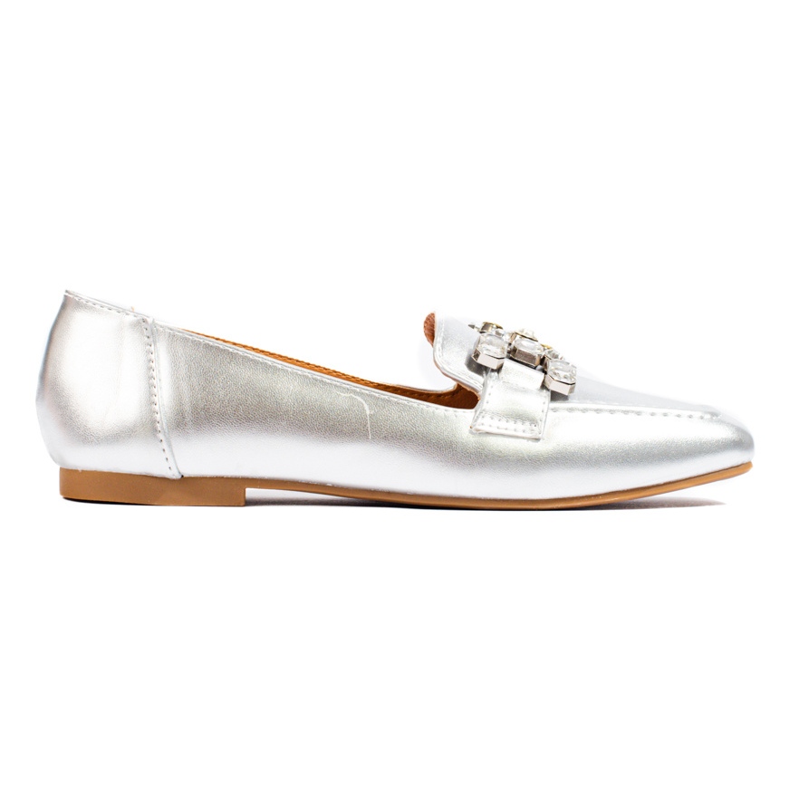 Silvermockasiner för kvinnor med en Shelovet-dekoration är ett förslag som kombinerar elegans med vardagskomfort. Dessa snygga skor, gjorda av högkvalitativt läderimitation, kännetecknas av sin metalliska silverfärg, som väcker uppmärksamhet och lägger till chic till varje styling.