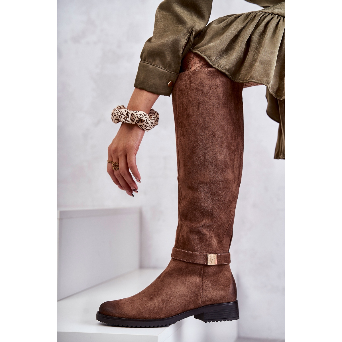 Stövlarna har en platt 3,5 cm hög klack, vilket garanterar komfort att bära hela dagen. Den förstyvade häldisken och den isolerade skofiltsinsatsen ser till att fötterna får ordentligt stöd och skyddas mot kyla. En snygg detalj i form av ett bälte med en metallplatta ger karaktär, och den oregelbundna änden på ovandelen ger skorna ett modernt utseende.