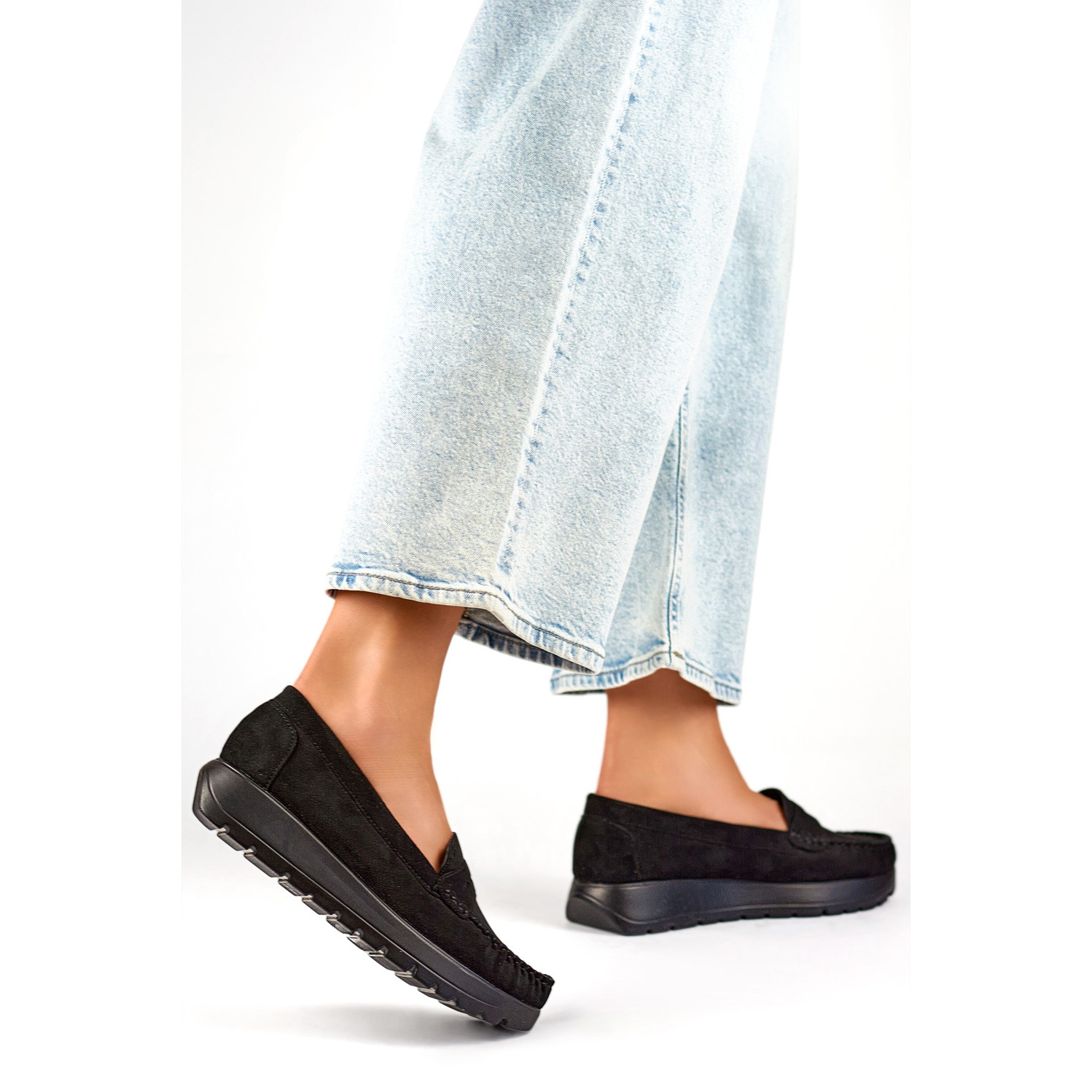Mockasiner har en insats av naturläder, som ger optimal ventilation och komfort att bära. Höjden på plattformen på 3,5 cm lägger till subtil elegans och gör dem till en idealisk lösning både dagligen och för mer formella tillfällen. Stabilitet säkerställs av en solid design, och Slip -Up -skäret gör det lättare att ta på sig och ta av dina skor.