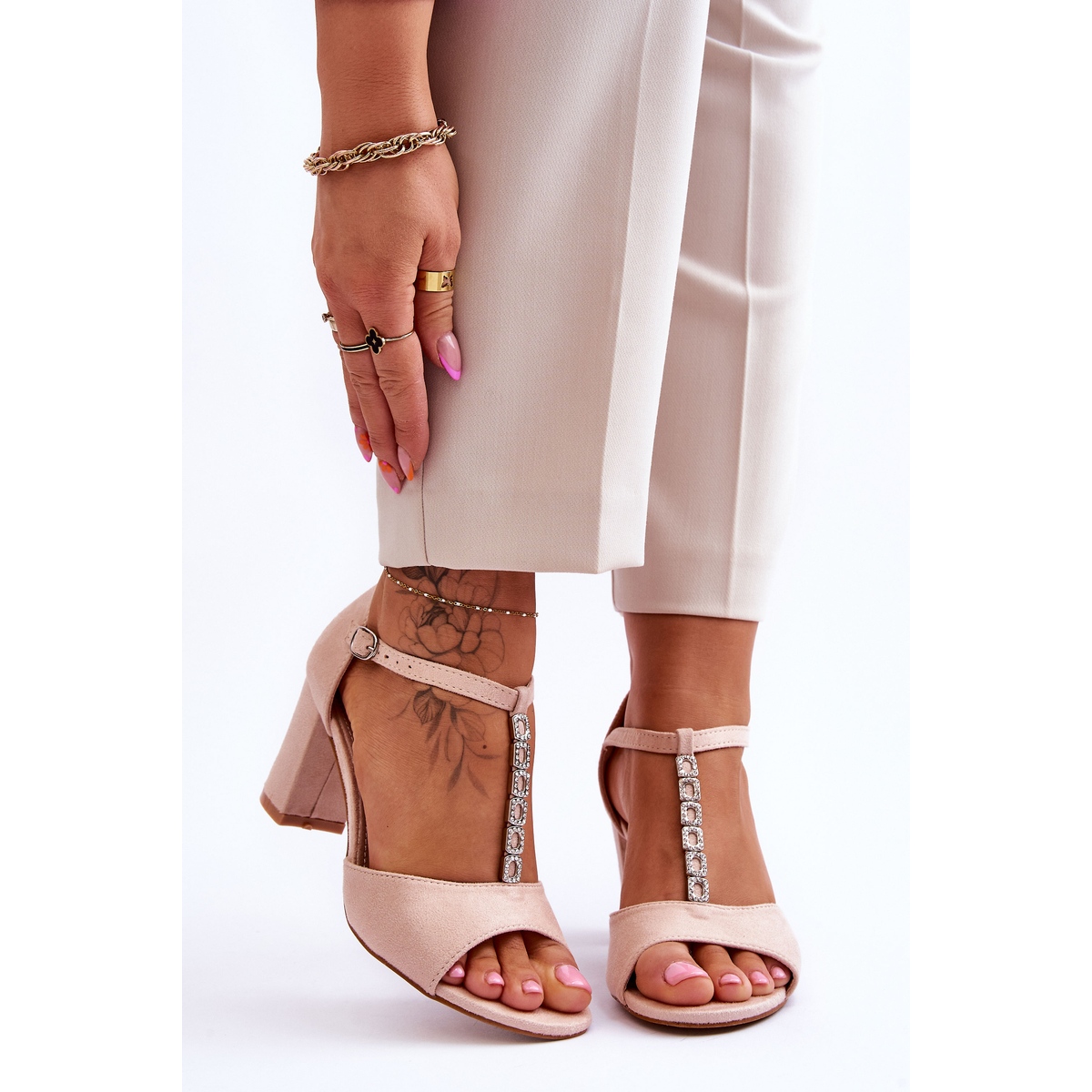 Sandalerna är gjorda av högkvalitativ eko-mocka och har subtila remmar dekorerade med strass som effektivt imiterar strass, vilket ger klass och glans. En justerbar rem med spänne och en förstyvad häl säkerställer perfekt passform och stabilitet, vilket gör att du kan njuta av dem hela dagen utan att behöva oroa dig för obehag.