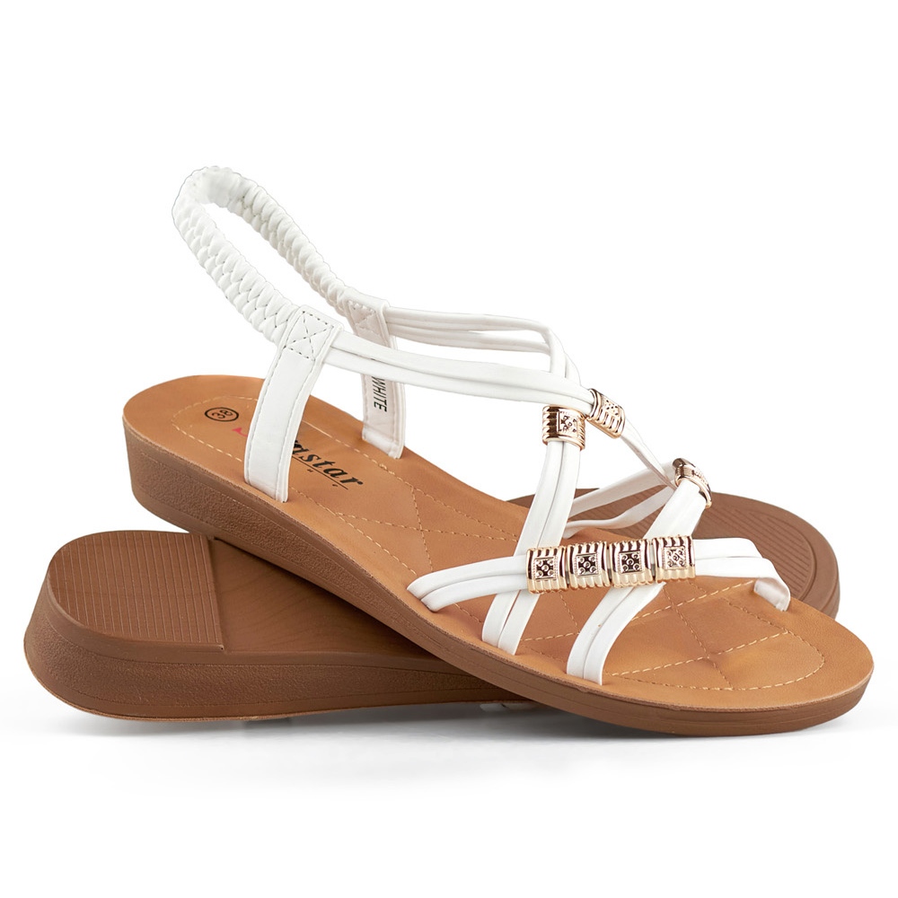 Detaljer: Damsandaler med resårband med gulddekor vit