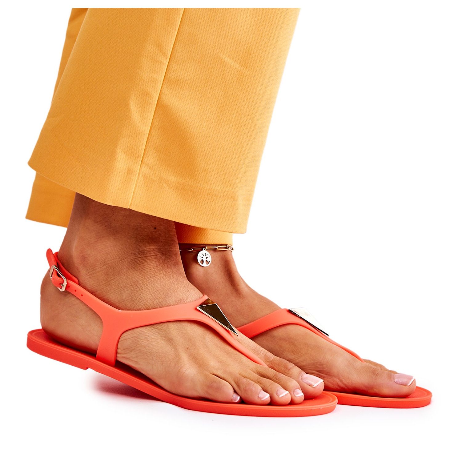 Sandalerna fästs runt ankeln med en justerbar rem med spänne, vilket möjliggör en perfekt passform till varje ben. I mitten finns ett imponerande triangelformat emblem som ger helheten en originell karaktär. Tack vare sin klassiska form och intensiva färger kommer dessa flipflops att bli en oumbärlig del av varje kvinnas sommargarderob.