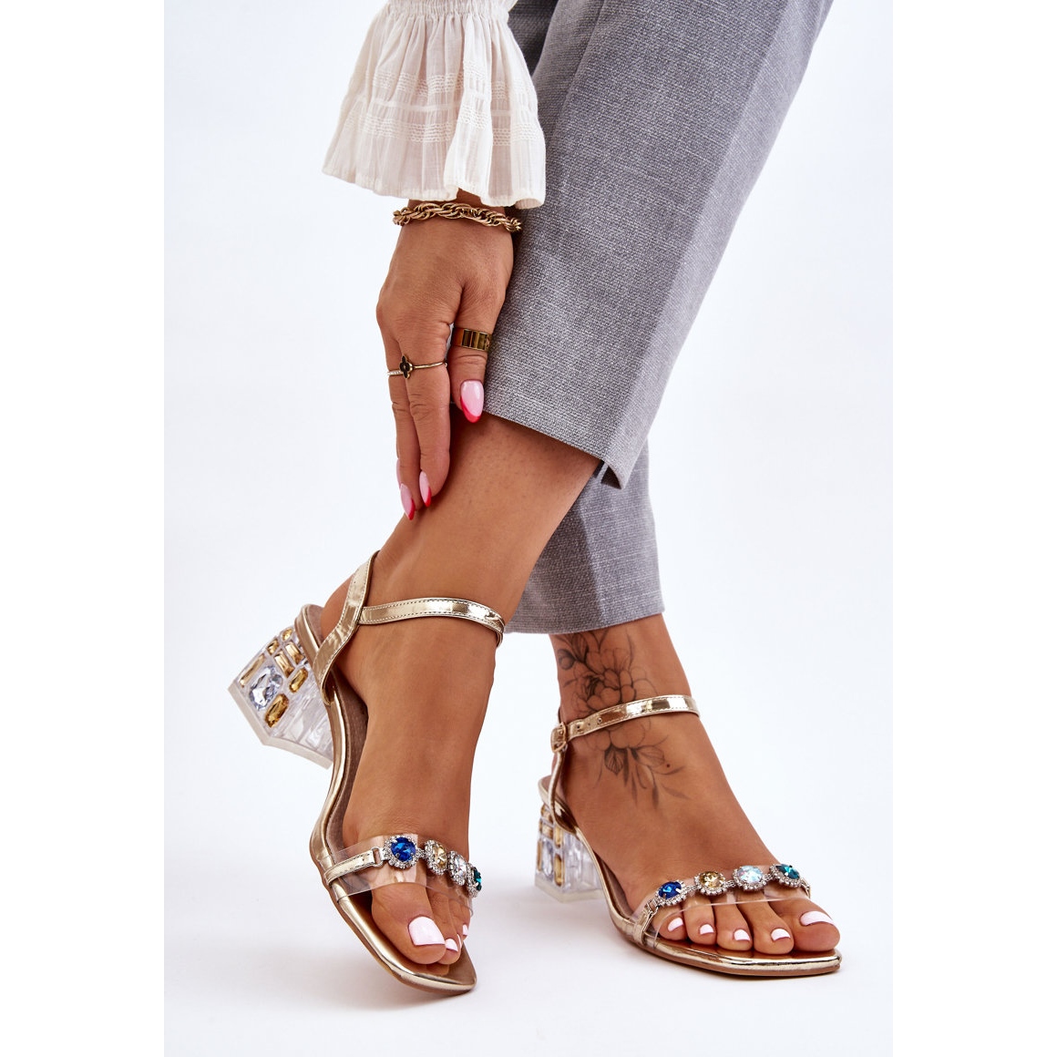Dessa sandaler har en låg, dekorerad blockklack och garanterar stabilitet och komfort att bära. Dekorativa jetstrålar på framsidan ger dem en unik glans, perfekt matchande olika stilar. En justerbar rem med ett spänne runt fotleden ger en perfekt passform till foten, vilket ökar bärkomforten.