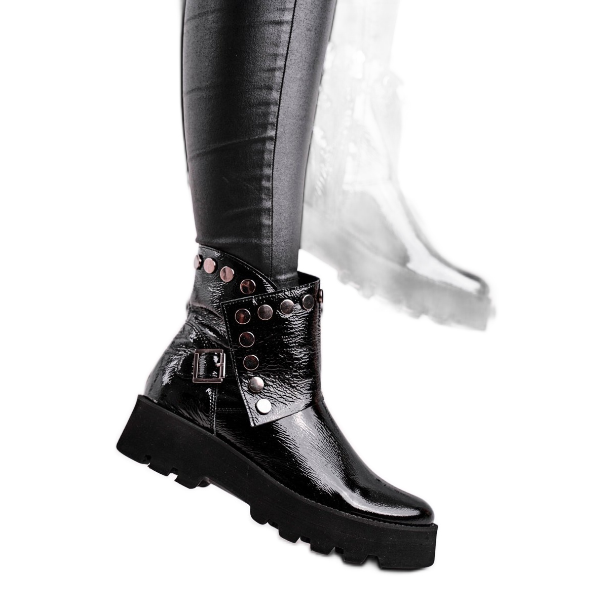 Kvinnors svarta lackstövlar Exquisite 1199 är ett oersättligt inslag i varje elegant garderob. Tillverkade av högsta kvalitet naturligt läder, dessa stövlar glädje med både stil och noggrant utförande. Deras mjukt skrynkliga struktur i kombination med metalliska, dekorativa tryckknappar på den stora fliken ger dem en unik karaktär.