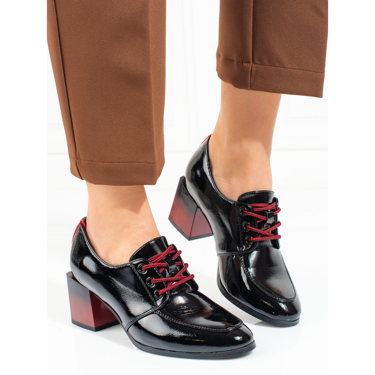 Skornas ovansida är gjord av högkvalitativt läderimitation, och deras lackerade finish ger en elegant karaktär. Insidan av skorna är dekorerad med en kombination av 50% naturligt läder och 50% konstläder, vilket garanterar tillräcklig ventilation och en behaglig känsla att bära. Svarta, släta plastsulor säkerställer soliditet och hållbarhet, och den runda tån bidrar till skodonets attraktiva utseende.