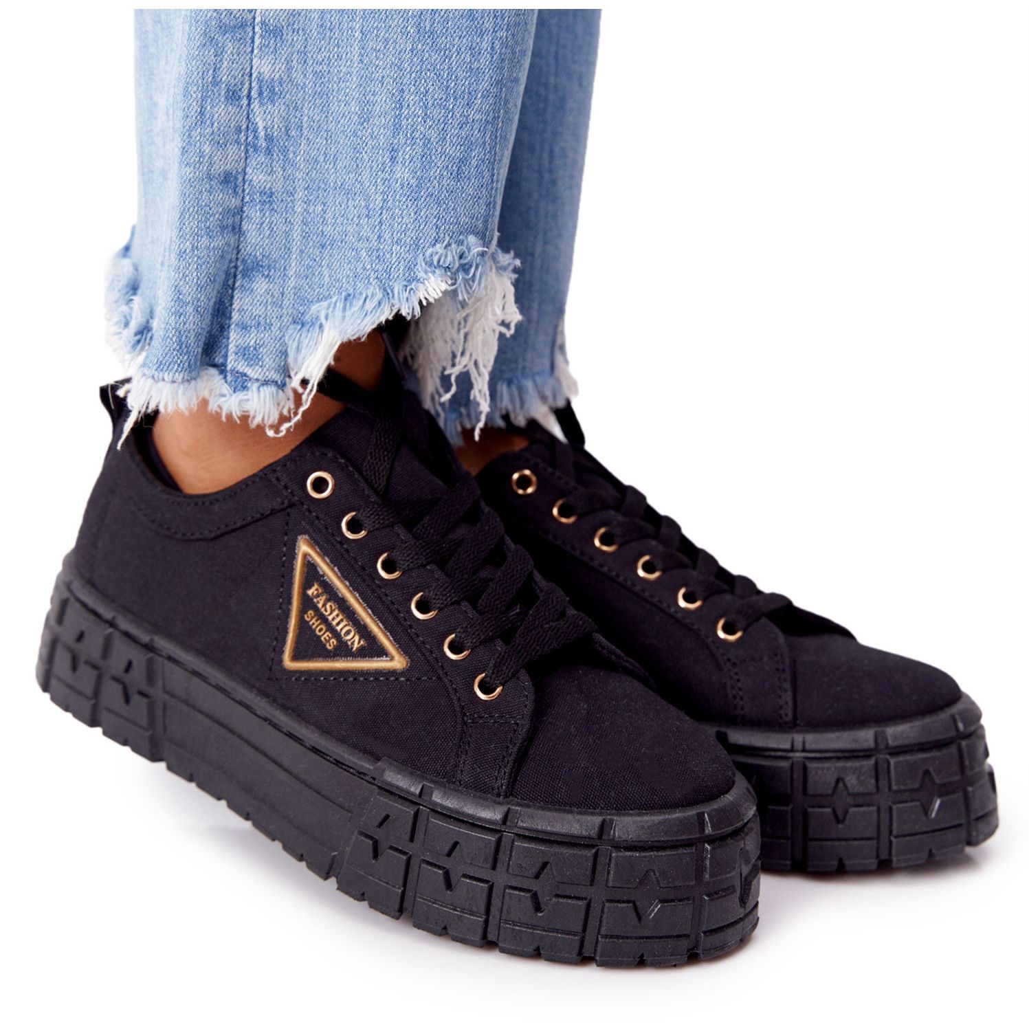 Den 4 cm höga plattformen lägger inte bara till några centimeters höjd, utan gör också dina steg mer självsäkra tack vare den halkfria sulan. Modellen kännetecknas av en rund tå, vilket ger den lätthet och frihet. Du behöver inte oroa dig för kylan eftersom sneakersna är gjorda av tyg, vilket ger tillräcklig ventilation, men de är inte isolerade.