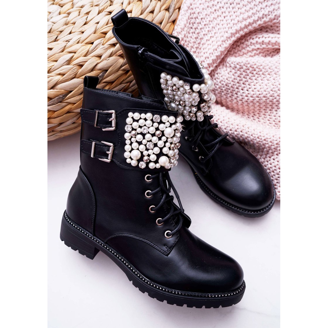Upptäck ett nytt ansikte av elegans och komfort med SEA Bemmer ankelstövlar för kvinnor. Dessa svarta militärkängor är det perfekta valet för kallare dagar, och kombinerar moderiktig design med praktiskt. Deras höga ovandel skyddar fotleden perfekt, och sidofästningen dekorerad med vackra pärlor och zirkoner ger dem en unik karaktär.