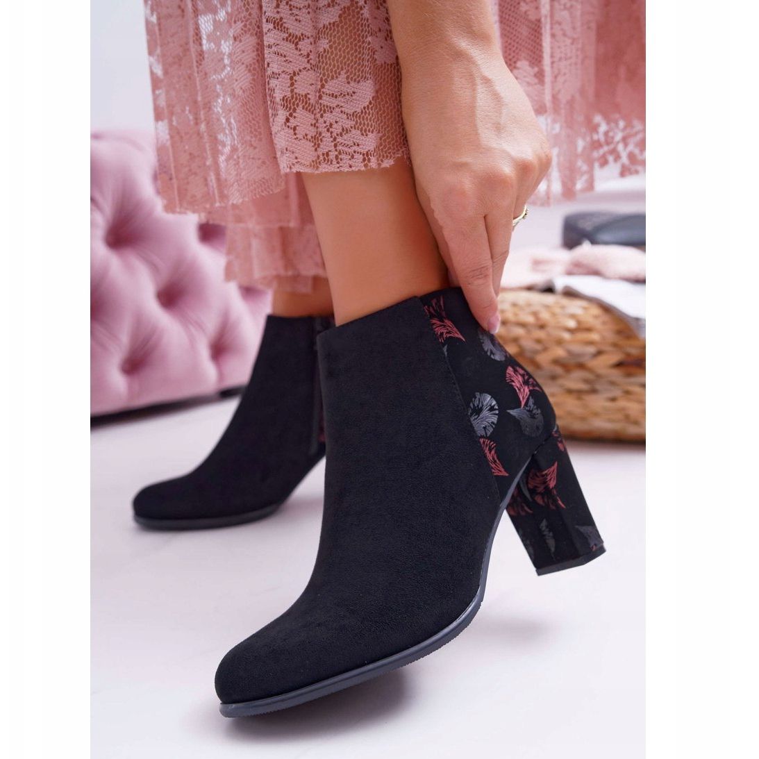 Detaljer: Damskor på högklackat Sergio Leone med rosa blommor Folk Svart Eros2