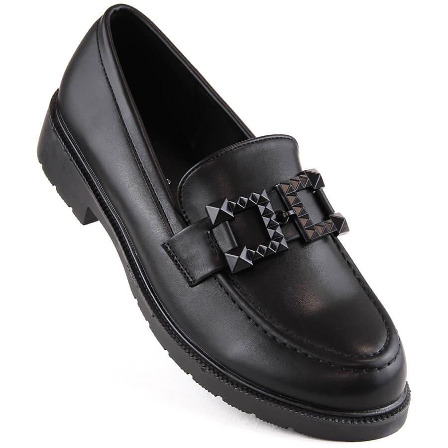 Kvinnaskor, loafers gled med prydnad, Black S. Barski HY371 är ett idealiskt förslag för kvinnor som värderar stil och komfort. Dessa eleganta skor från S. Barski -varumärket kännetecknas av en minimalistisk design och en tidlös svart färg, som perfekt passar in i olika stiliseringar.