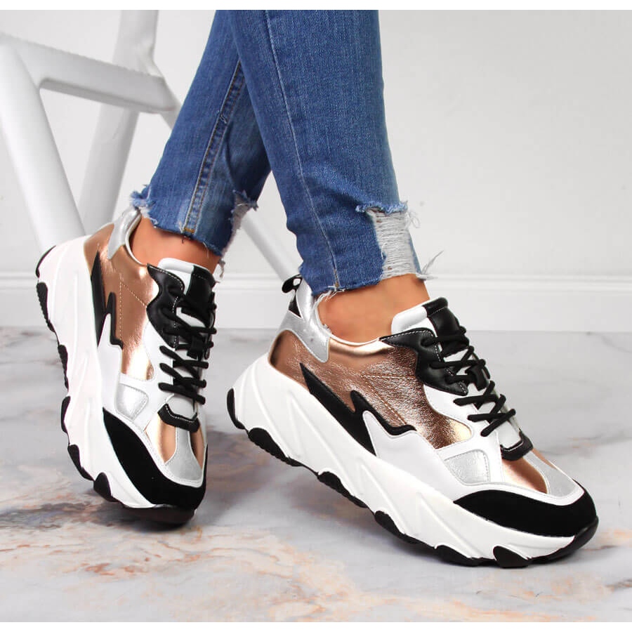 Detaljer: Damsneakers på den vita och guldiga Potocki-plattformen gyllene