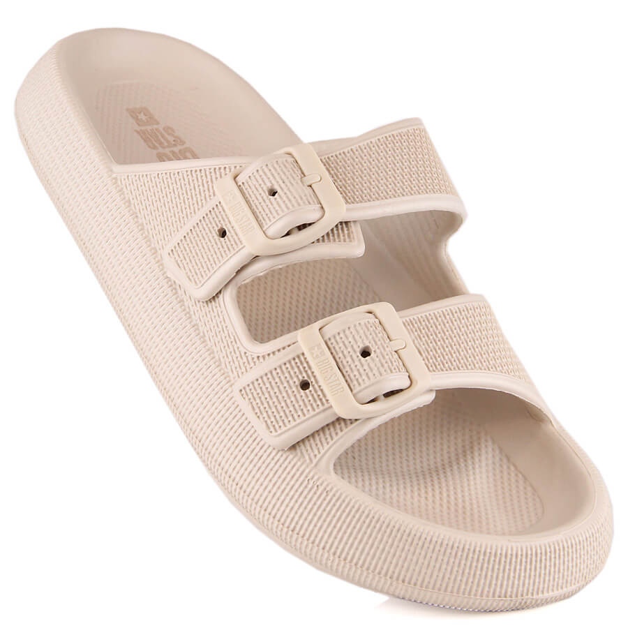 Beige plattformssportflipflops för kvinnor Big Star LL274611 är ett måste för sommardagar. Tillverkade av högkvalitativ plast garanterar de inte bara ett elegant utseende, utan också komfort att bära. Deras intressanta design hänvisar till aktuella modetrender, vilket gör dem till ett perfekt komplement till casual stilar.