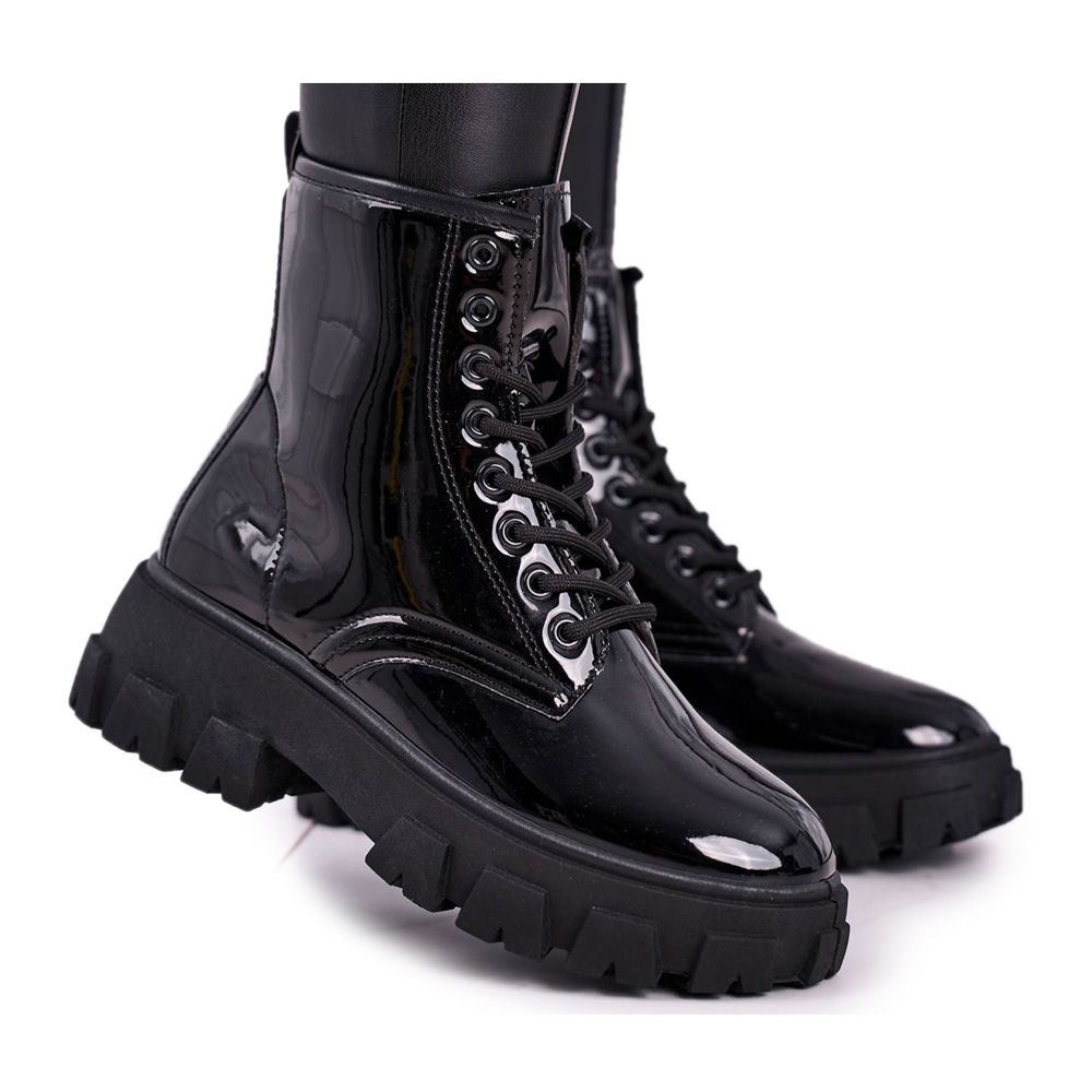 Designen med dragkedja i sidan och rejäl snörning gör det enkelt att ta på och justera skorna, vilket gör dem extremt praktiska. Den svarta, lackade finishen ger dem en elegant karaktär som passar perfekt till olika outfits.