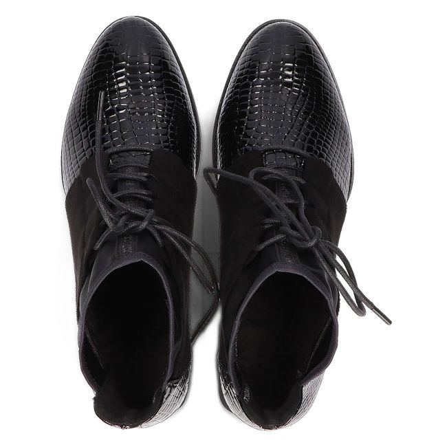 Tack vare kombinationen av flera typer av läder med olika texturer ser dessa stövlar extremt moderna och snygga ut. Deras delikata, platta häl och ovandel med snörning garanterar komfort och iögonfallande detaljer ger karaktär till helheten.