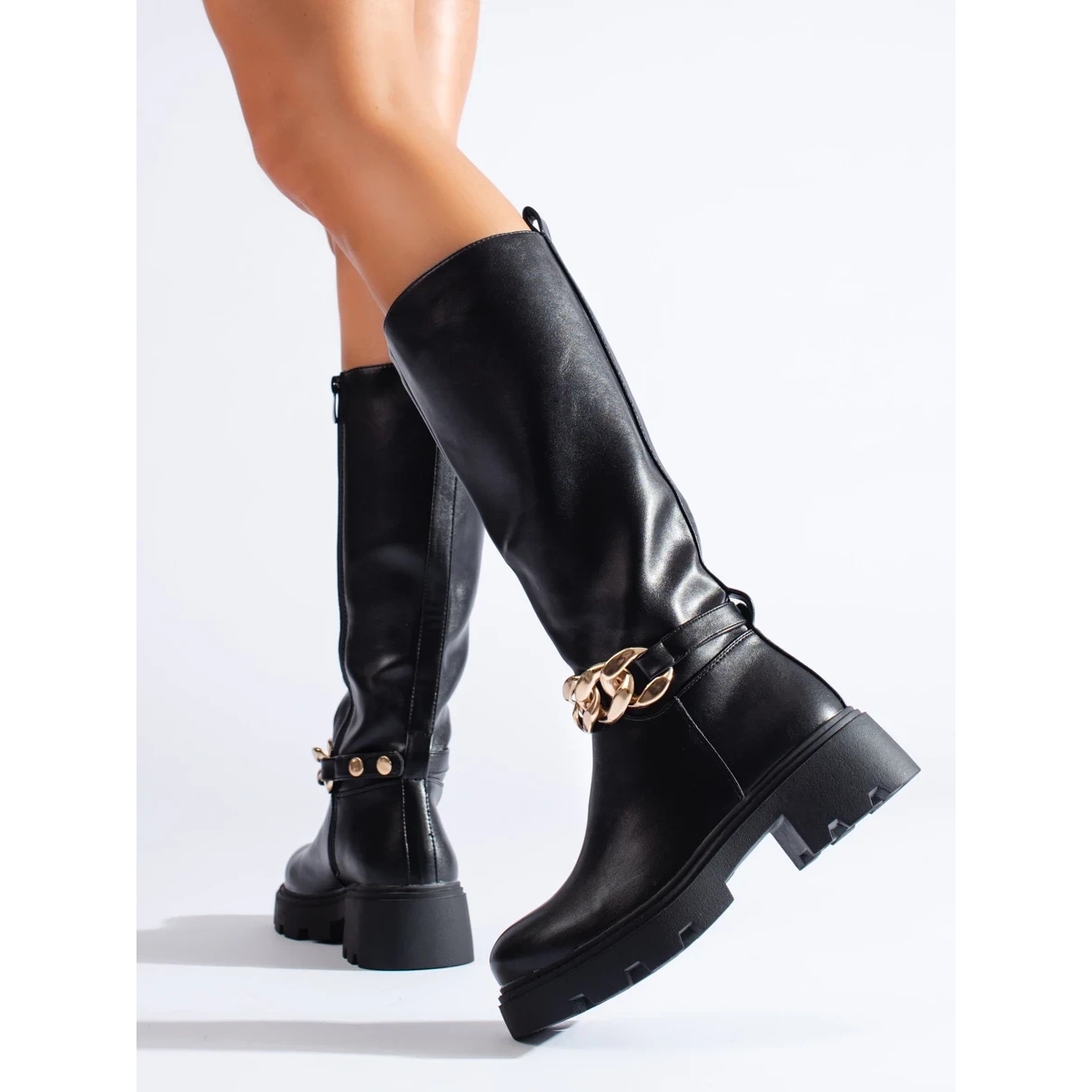 Kvinnestövlar över knäet med en kedja - svart, ekologiskt läder