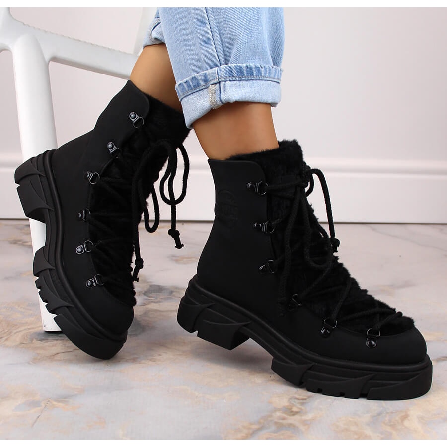 Stövlar kombinerar bekvämligheten som är typisk för arbetare med isolering som behövs på vintern - pälsen inuti ger värme, och plattformen lägger till några centimeter utan att förlora stabilitet. Svart, enkelt snitt utan mönster gör att skorna lätt matchar många stilar - från jeans och nedjacka, genom tjocka tröjor, till urbant totalt utseende.