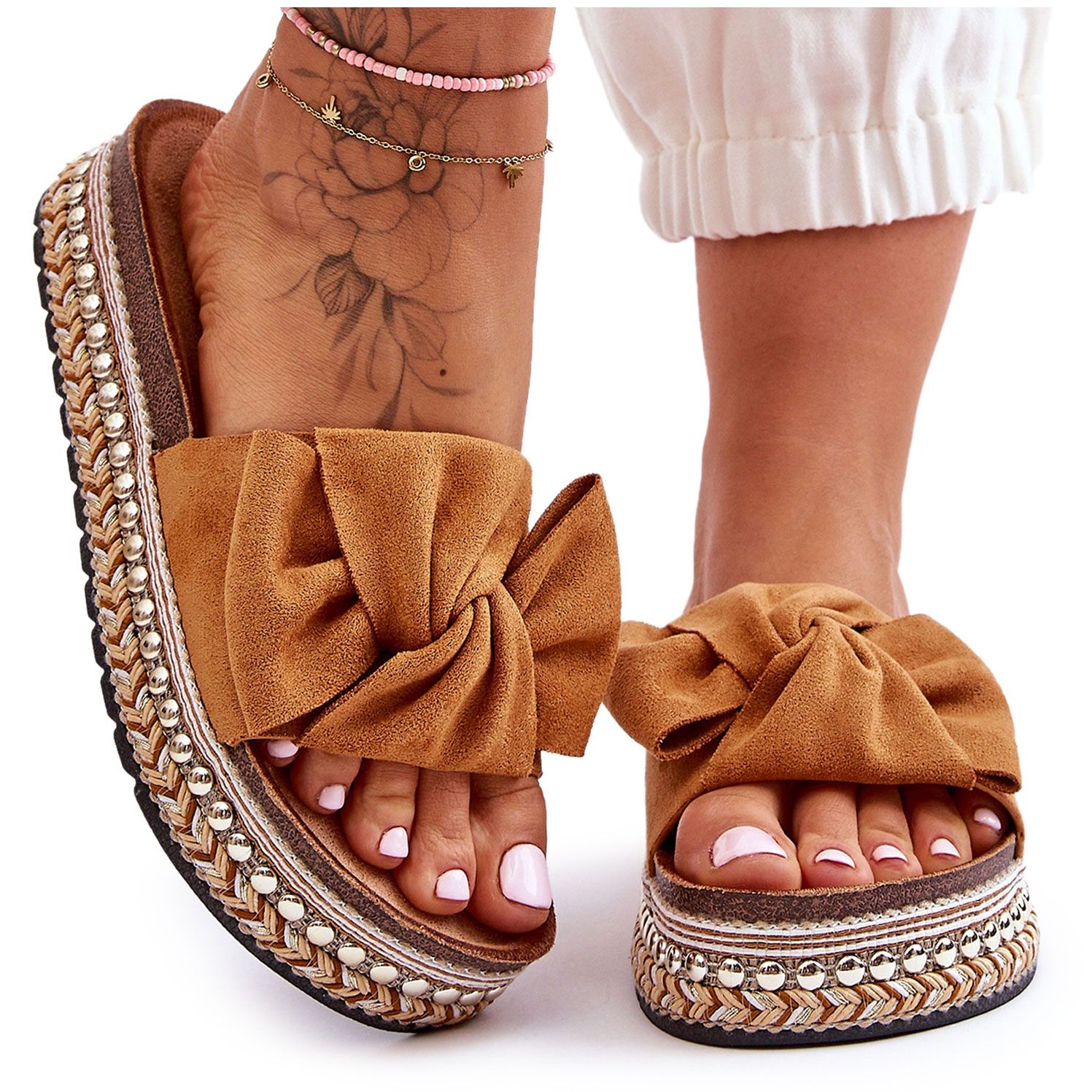 Detaljer: Damtofflor i mocka med kamel Lauria rosett brun