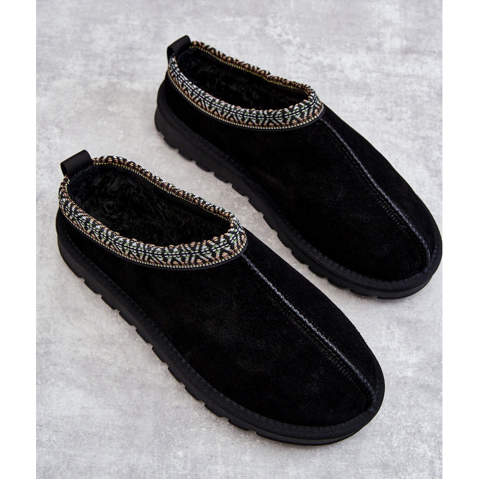 Varm, snygg och mycket bekväm - perfekt för kalla dagar tillbringade hemma. Tillverkad av naturligt mocka läder, isolerat med en mjuk, tjock päls, monterad på en massiv plattform med en icke -glidsula. Klassiska svarta färger och subtil dekor på de övre gör att tidningarna ser eleganta ut och samtidigt ger komfort under dagen.