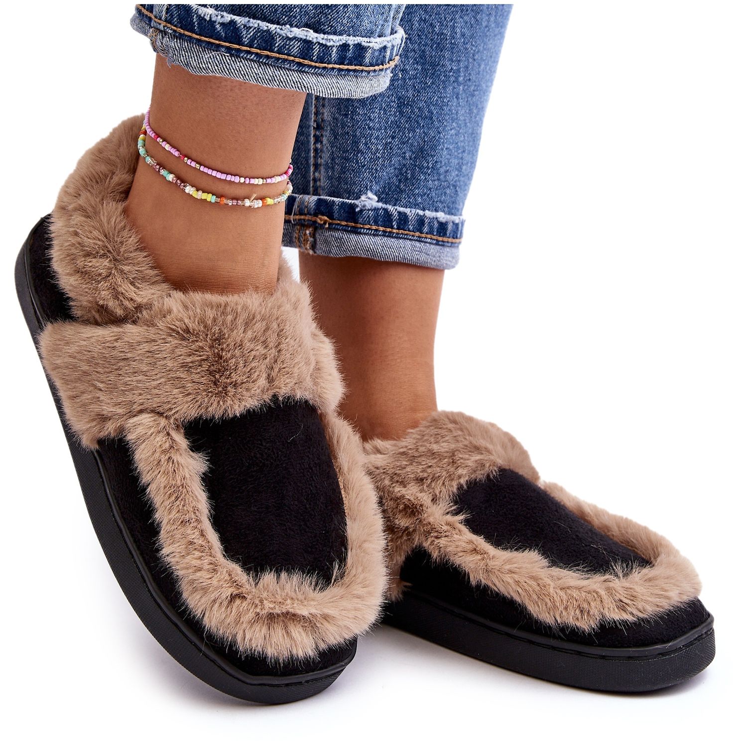 Den eleganta svarta färgen och den extra accenten av beige päls gör dessa tofflor till det perfekta komplementet till din hemoutfit. Dessutom gör den eleganta eko-mocka-finishen att denna modell skiljer sig från andra produkter som finns på marknaden.