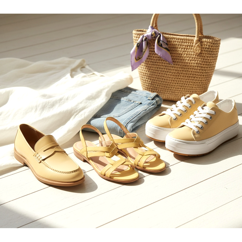 Färg nummer ett för säsongen vår/sommar 2026 är smörgul – en varm, smörgul som ser ut som om den badar i solljus. Det är inte en flashig neongult, utan en delikat, krämig nyans som påminner om smör eller vaniljkräm. Det fungerar utmärkt med skor – sandaler, loafers och sneakers i denna färg ger fräschör och optimism till stylingen.