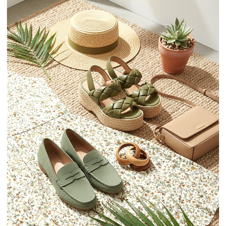 Gröna ser extremt imponerande ut i skor. Salvia-färgade mocka loafers är en smart casual hit, och oliv plattformssandaler kommer perfekt att komplettera en blommig sommarklänning. Grönt kombineras vackert med brunt, beige, krämfärgat och vitt.