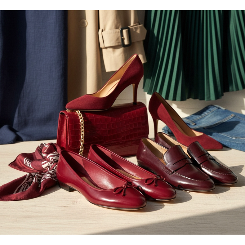 Körsbärsbalettlägenheter eller loafers kommer att fungera bra med både en ljus kostym och en enkel vit klänning. Burgundy pumps är det perfekta valet för kvällsutflykter. Kombinera dessa färger med marinblått, beige, mörkgrönt och denim.