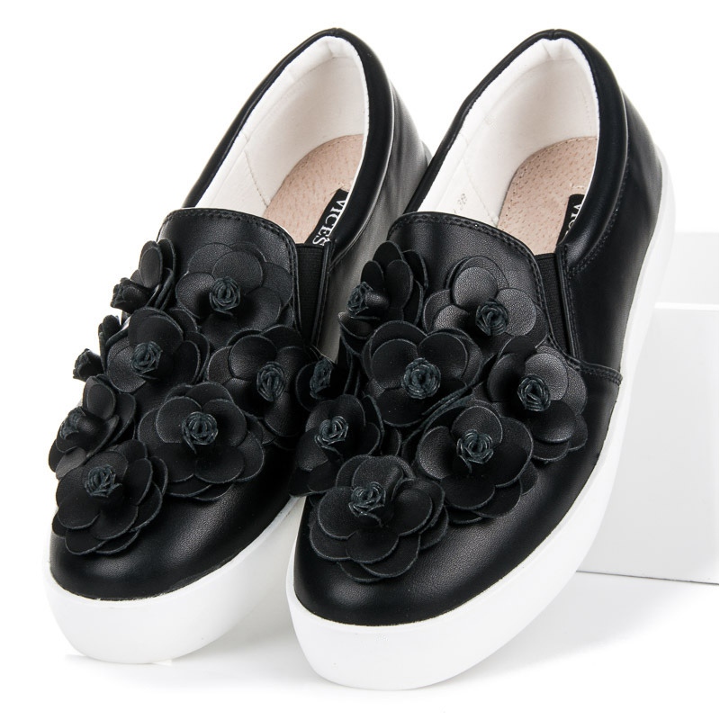 Upptäck unik elegans och komfort med svarta Vices slip-ons, som säkert kommer att bli en oumbärlig del av din garderob. Dessa iögonfallande skor passar perfekt till en mängd olika stilar, både vardagliga och mer eleganta. Deras delikata dekorationer i form av original, små blommor ger dem en subtil charm, som skiljer dem från andra modeller.