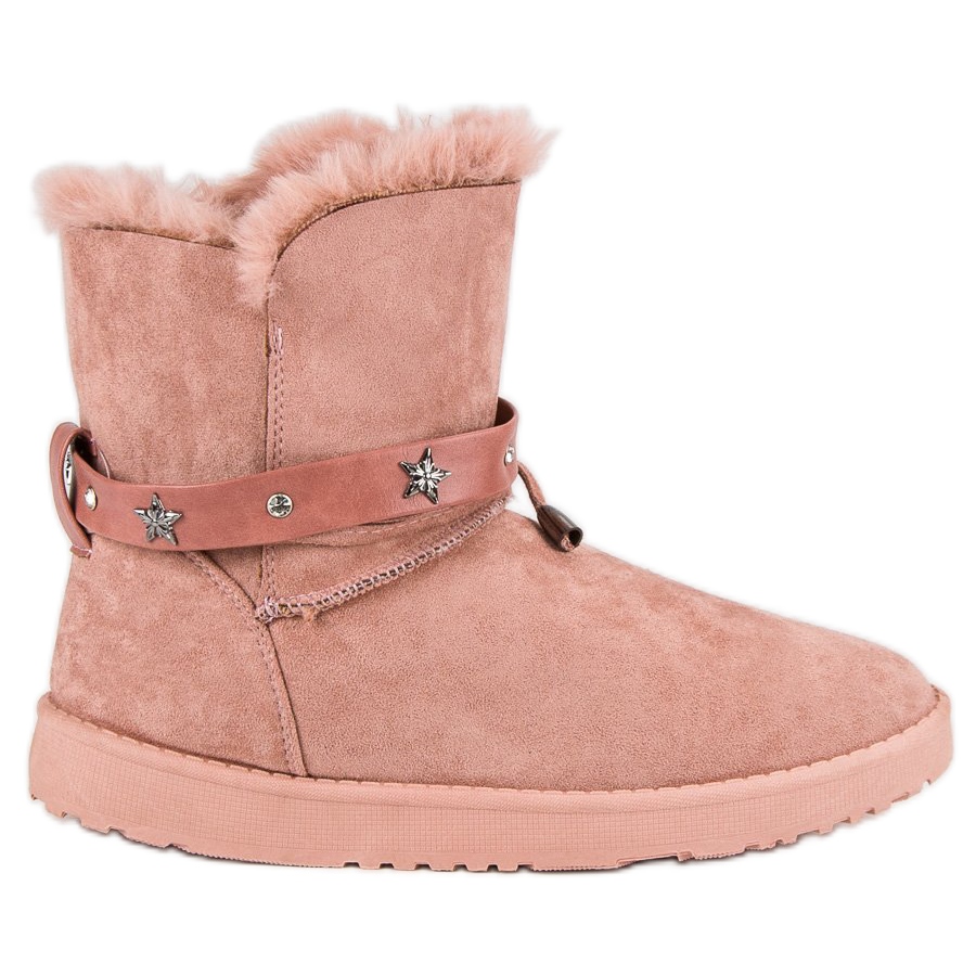 Tillverkad av ekologisk mocka, höga mukluks når över anklarna, skyddar benen mot kyla. En iögonfallande rosa rem gjord av ekologiskt läder och subtila strass ger dem en unik karaktär. Slip-on-designen gör det enkelt att ta på och ta av sig skorna, och den 2,5 cm höga plattformen garanterar komfort vid varje steg.