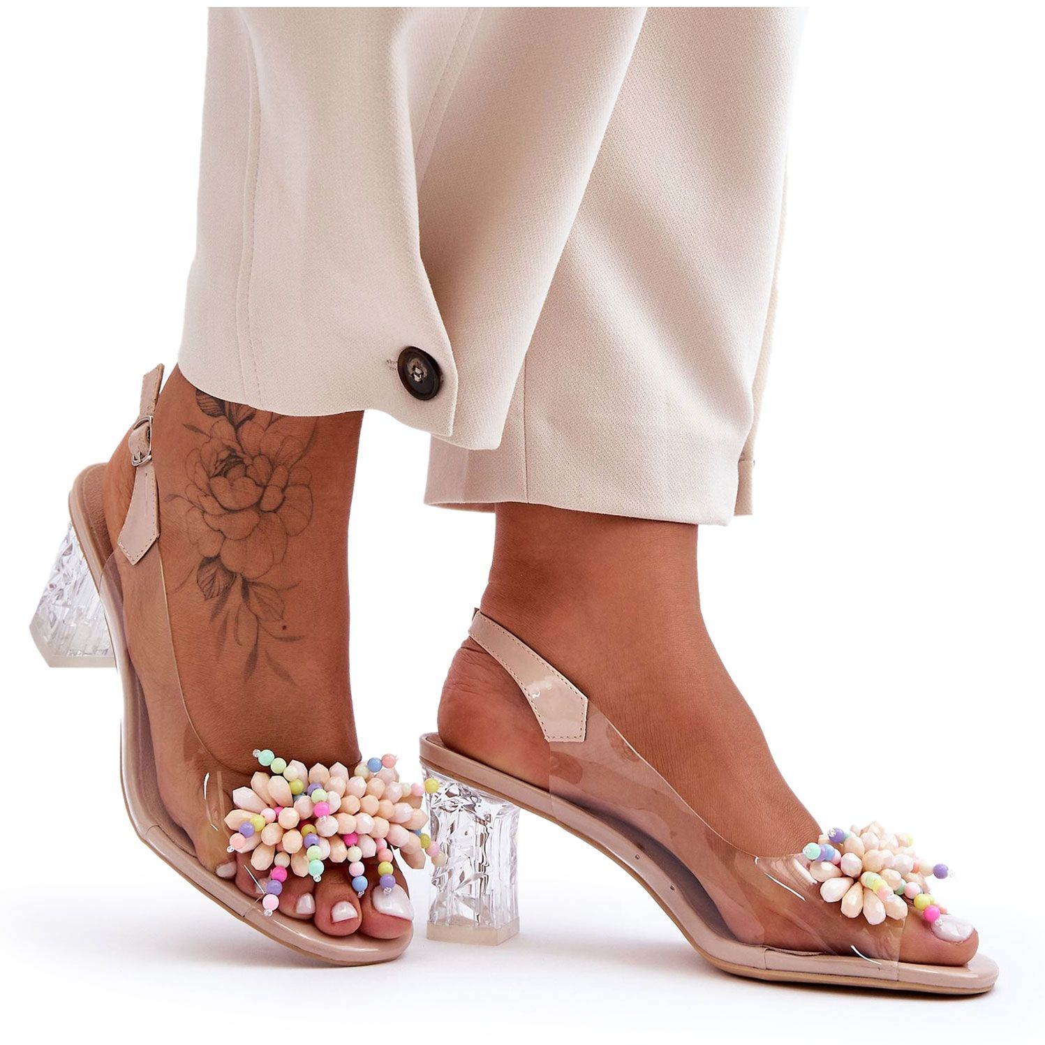 Eleganta sandaler S. Barski MR1037-23 Kombinera modern minimalism med en subtil glöd. Den transparenta övre är inställd på en transparent 7 cm hög stolpe, och framsidan är dekorerad med många pärlor och strass i multi -färgade ton, som ger en lätt, unik karaktär. Beige Shade (Beige) gör skorna extremt mångsidiga - perfekta för sommarklänningar, avslappnade uppsättningar med jeans eller mer elegant utseende.