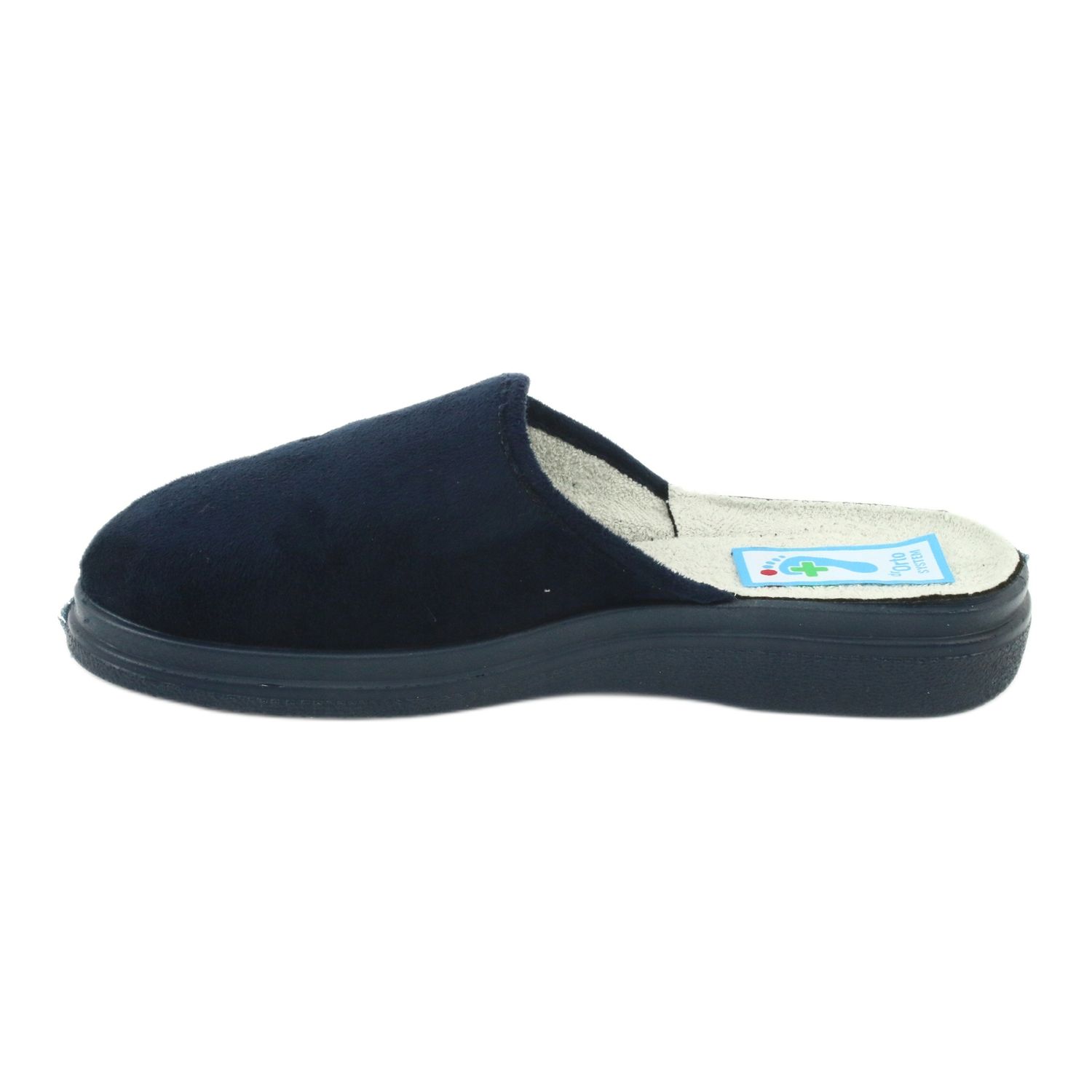 Bekväma och säkra tofflor från det polska märket Befado från Dr.-linjen. Orto, modell 132D012 i en elegant nyans av marinblått. Designad för personer som behöver särskild vård för sina fötter, inklusive personer med diabetiker. De har certifikatet "HEALTHY FOOT".