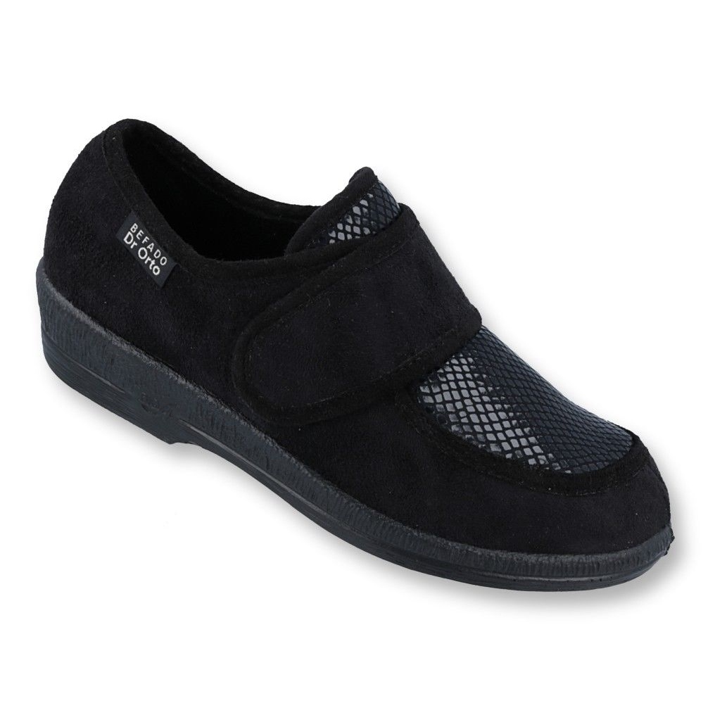 DR.ORTO Befado PU 984D012 - bekväma, praktiska damskor i svart, designade för vardagskomfort - hemma och utanför. Den flexibla ovandelen av stretchigt tyg anpassar sig till den deformerade foten och kardborreknäppningen möjliggör snabb och bekväm påtagning och exakt justering. Sulan av elastisk PU absorberar mikroskador och förbättrar dämpningen när du går.