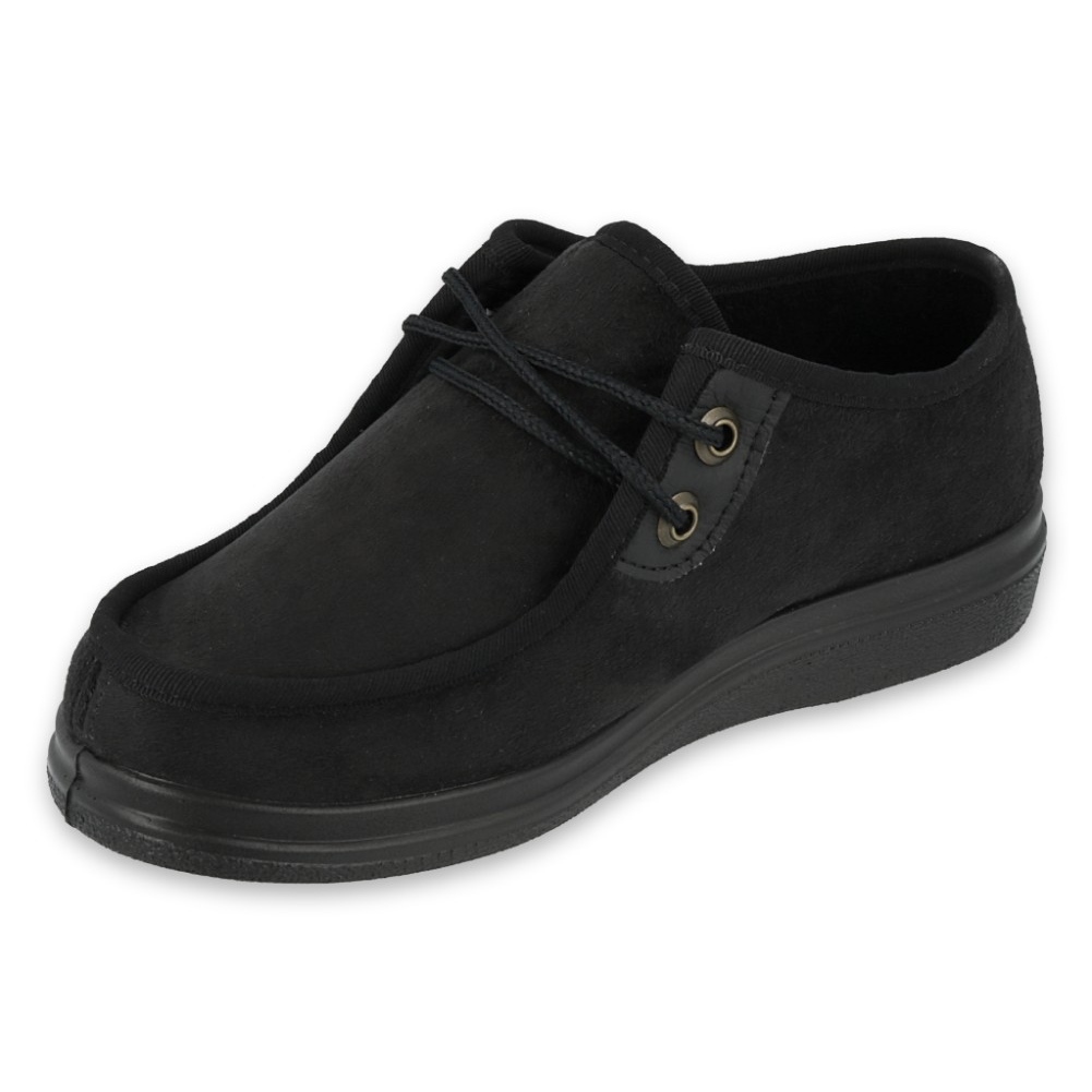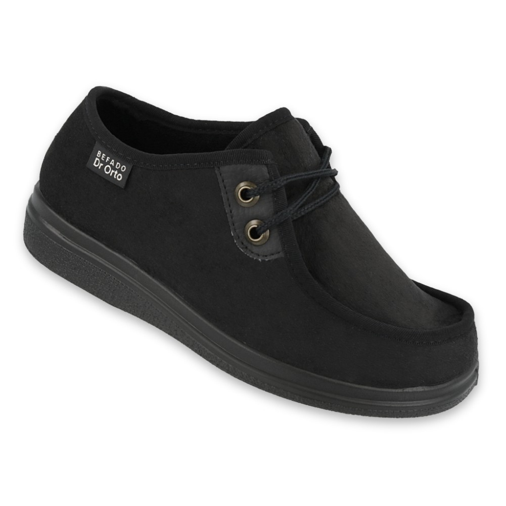 DR.ORTO Befado 871D004-modellen är damskor designade för personer med känsliga fötter och diabetiskt fotsyndrom. Den ömtåliga, skummade inre strukturen och det minskade antalet sömmar och leder minimerar risken för irritation, samtidigt som det ger ett mjukt och stabilt stöd vid daglig användning. Den universella svarta färgen och den klassiska, runda tån gör skorna perfekta både hemma och för korta resor utomhus.