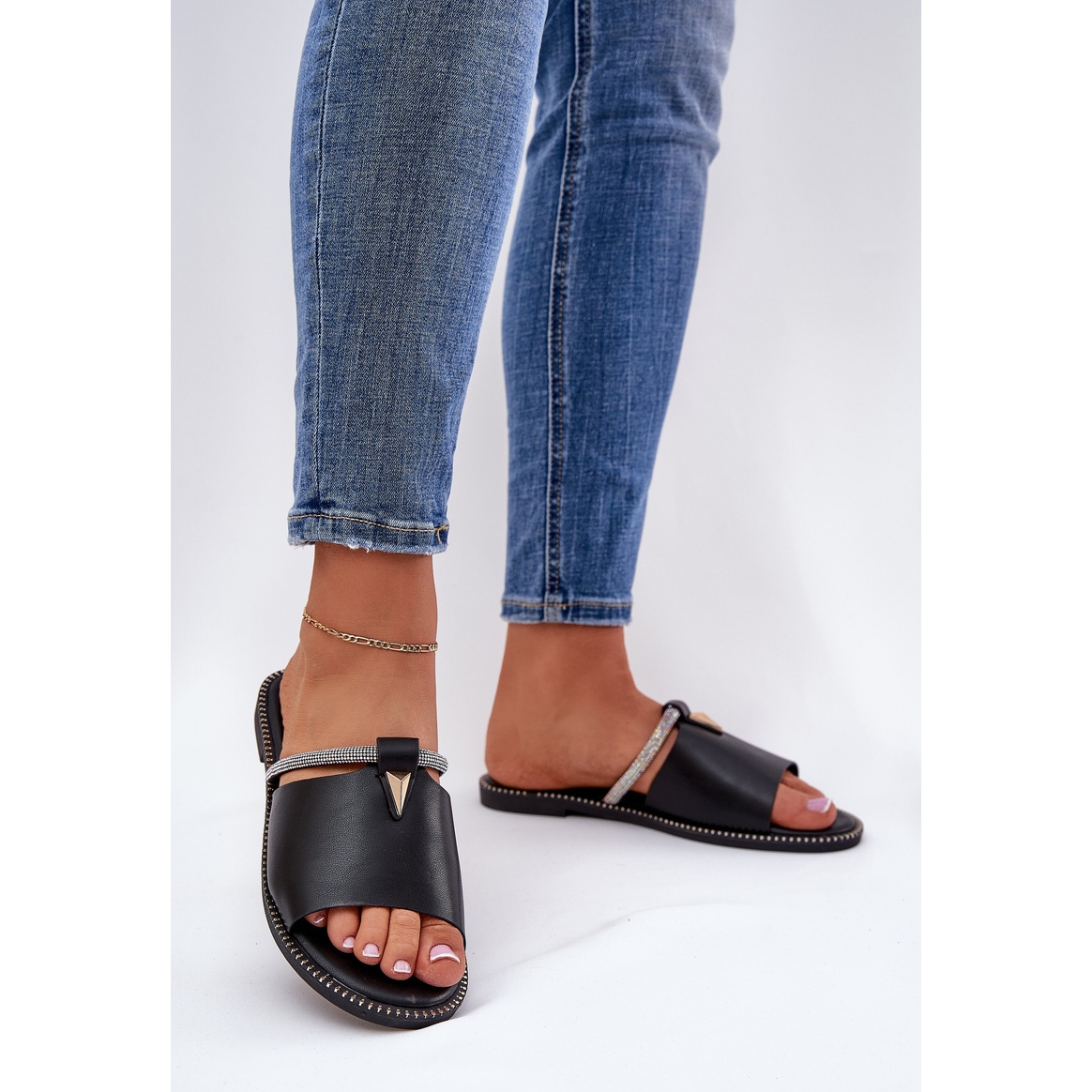 Upptäck elegans och komfort med plattflikar med ekläder, som är ett utmärkt val för varma dagar. Dessa snygga flip flops i en klassisk svart färg kännetecknas av en dekorativ remsa med zirkoner, vilket ger dem en speciell glöd. Perfekt för olika tillfällen kommer de att arbeta både varje dag och under mer eleganta utgångar.