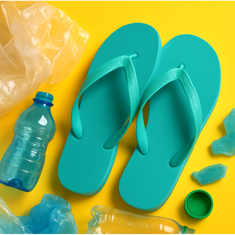 Enligt Sustainable Apparel Coalition står skoindustrin för cirka 1,4 % av de globala utsläppen av växthusgaser. Ett enstaka par billiga plastflipflops är: