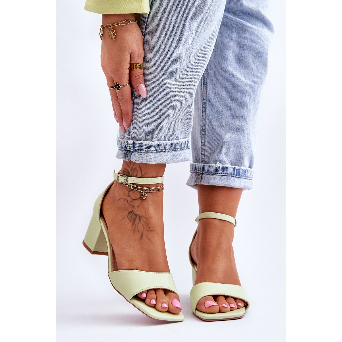 Denna modell kännetecknas av en låg klack i form av en elegant 6 cm hög stolpe, vilket gör dem bekväma att bära under långa perioder. Den exponerade, fyrkantiga tån ger dem ett modernt utseende, och den täckta hälen med en förstyvad häl ger stabilitet under gång. En justerbar rem med spänne ger en perfekt passform till foten.