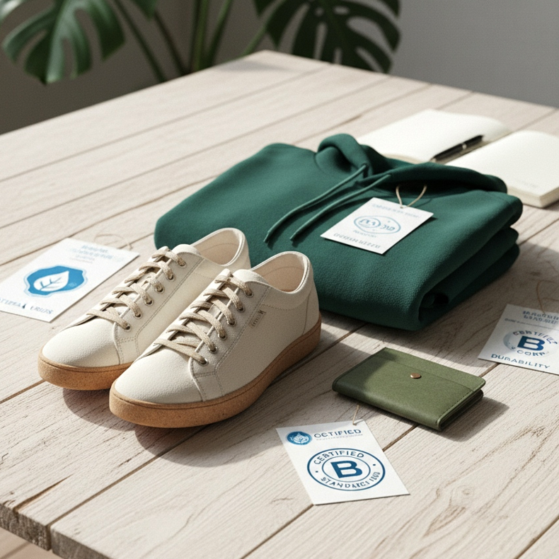 Bara omnämnandet av eko på etiketten garanterar inte att skorna faktiskt är miljövänliga. För att undvika greenwashing är det värt att känna till nyckelcertifikat. GOTS (Global Organic Textile Standard) bekräftar att textilmaterial tillverkas av ekologiska råvaror. OEKO-TEX Standard 100 garanterar frånvaron av skadliga kemikalier. B Corp-certifiering innebär att hela företaget uppfyller höga sociala och miljömässiga krav.