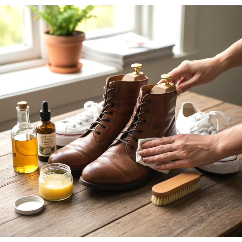 De mest miljövänliga skorna är de du redan har – så länge du tar hand om dem ordentligt. Regelbunden vård kan förlänga livslängden på skor till och med två gånger. Istället för syntetiska preparat fulla av kemikalier, använd naturliga alternativ: bivax för läderimpregnering, kokosolja för uppmjukning, äppelcidervinäger för att ta bort fläckar från tyger.