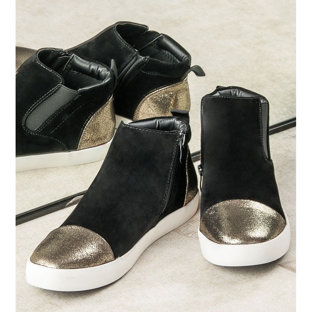 Vi presenterar eleganta J. Star-sneakers för kvinnor som perfekt kombinerar stil med komfort. Dessa svarta skor i eko-mocka har ett unikt utseende tack vare glänsande guldtoner på den rundade tån och hälen. Sneakersna knäpps med en praktisk dragkedja, och ovandelen når under anklarna vilket gör att de sitter perfekt på foten.