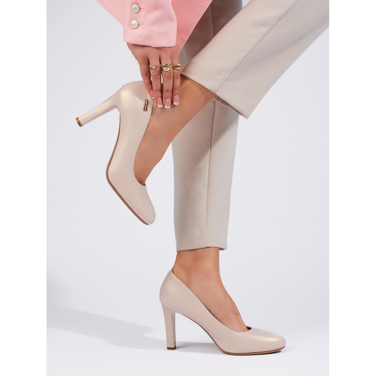 Upptäck elegans och komfort att bära tack vare pumpar på en hög stolpe från Sergio Leone. "Elegans" -modellen i en beige nyans är ett utmärkt val för kvinnor som värderar både stil och komfort. Dessa pumpar är gjorda av högkvalitativa ekologiska läder och glädjer med en minimalistisk design och en tidlös färg, som passar perfekt med olika stiliseringar.