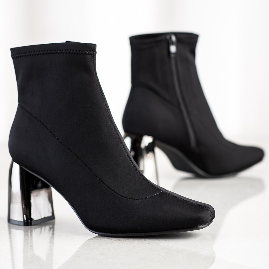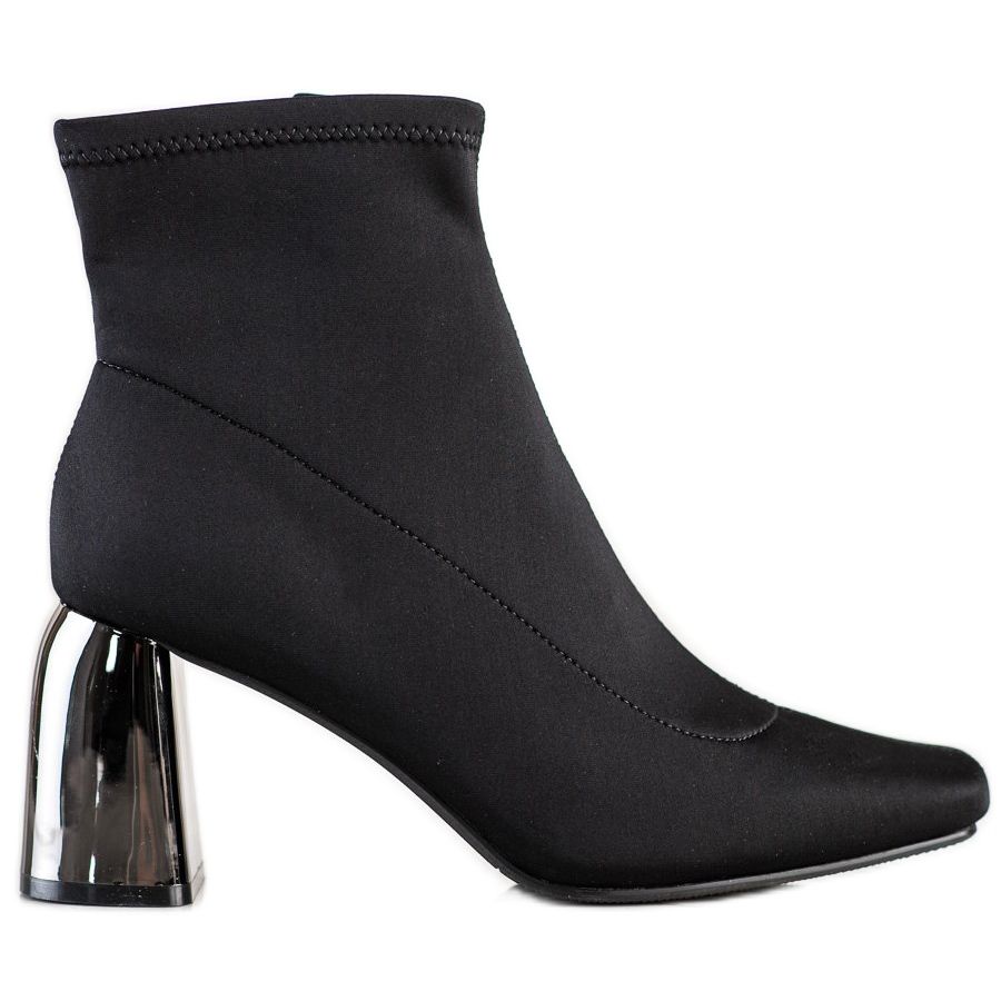 Eleganta högklackade ankelstövlar från märket M.Daszyński är det perfekta valet för kvinnor som värdesätter stil, elegans och komfort att bära. Dessa ankelboots är gjorda av högkvalitativt textilmaterial och kännetecknas av en minimalistisk design i en klassisk svart färg, vilket gör dem till ett universellt inslag i varje garderob.
