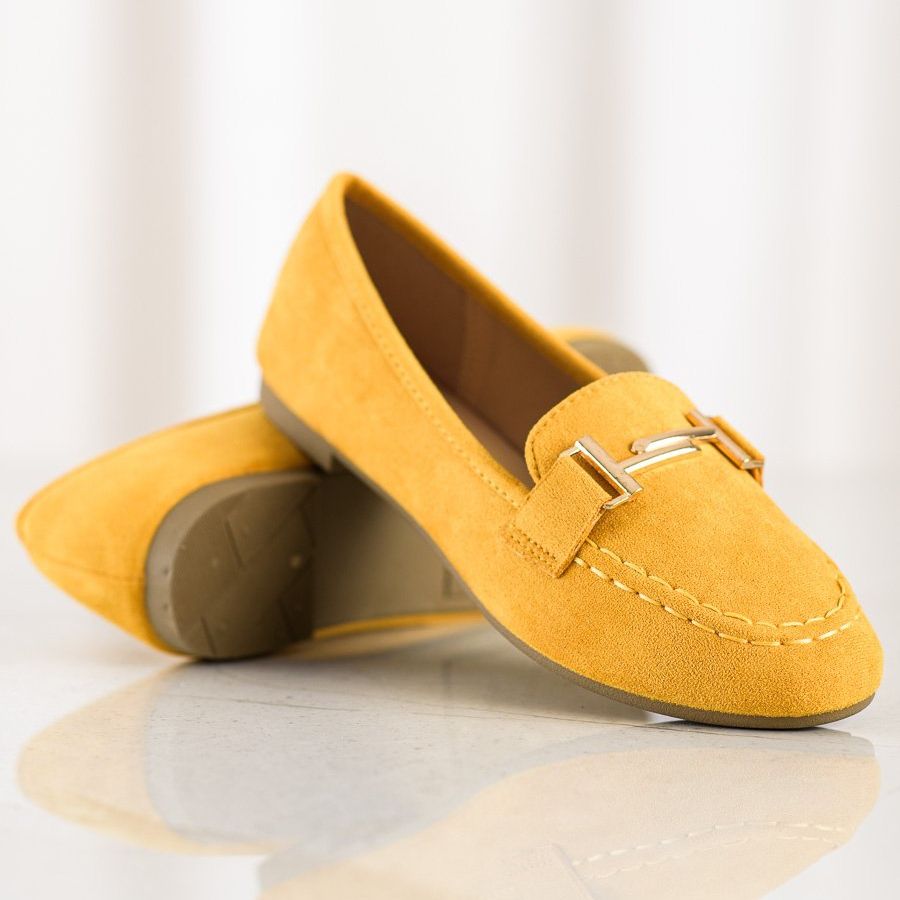 Mockasinerna har ingen klack, vilket garanterar komfort i alla situationer. En mjuk, inbyggd hälräknare och en rund tå gör dem inte bara praktiska utan också visuellt attraktiva. Det yttre materialet som imiterar mocka i kombination med en syntetisk sula med slitbana garanterar hållbarhet och stabilitet, och den fashionabla gula färgen kommer att ge fräschör till varje styling.
