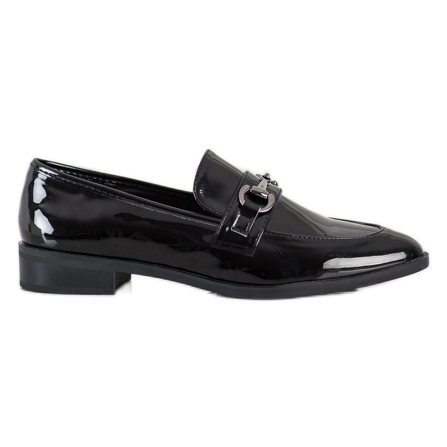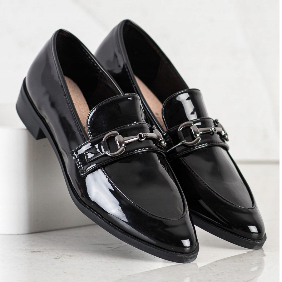 Tillverkade av ekologiskt lackläder ser mockasinerna extremt eleganta ut och är lätta att rengöra. Deras smala form, mandelformade tår och inbyggda, styvade hälräknare garanterar komfort och stabilitet när de bärs. Modellen kännetecknas av en slip-on-knäppning som gör det lättare att ta av och på skorna.