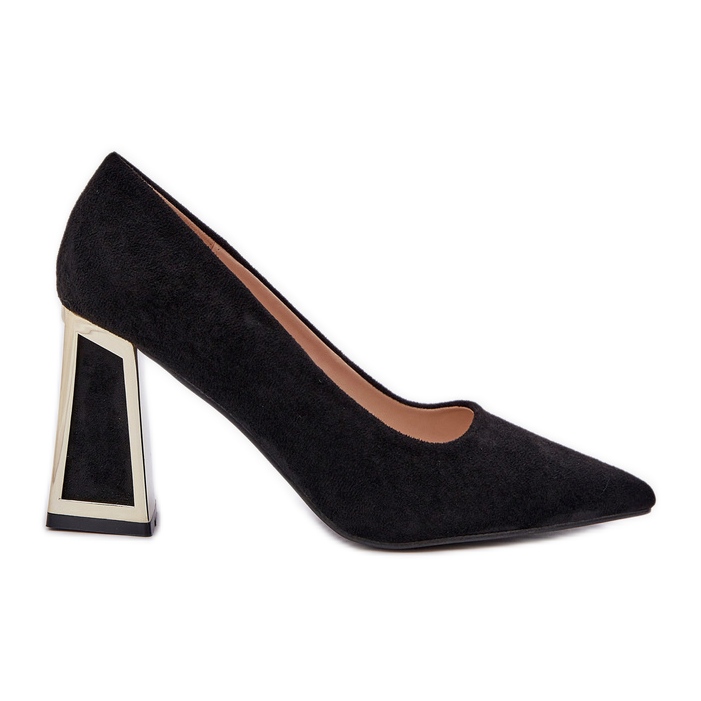 Vi presenterar eleganta pumpar på en pelare med spetsiga tår i en tidlös svart färg, vilket perfekt kompletterar dina kvällstyliseringar och eleganta kläder. Dessa pumpar är gjorda av högkvalitativa eko -mocka och kombinerar modern design med en klassisk stil.