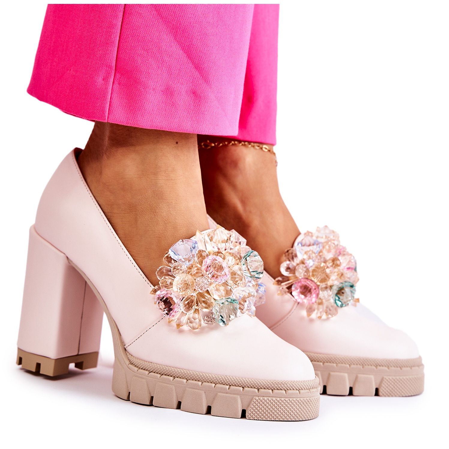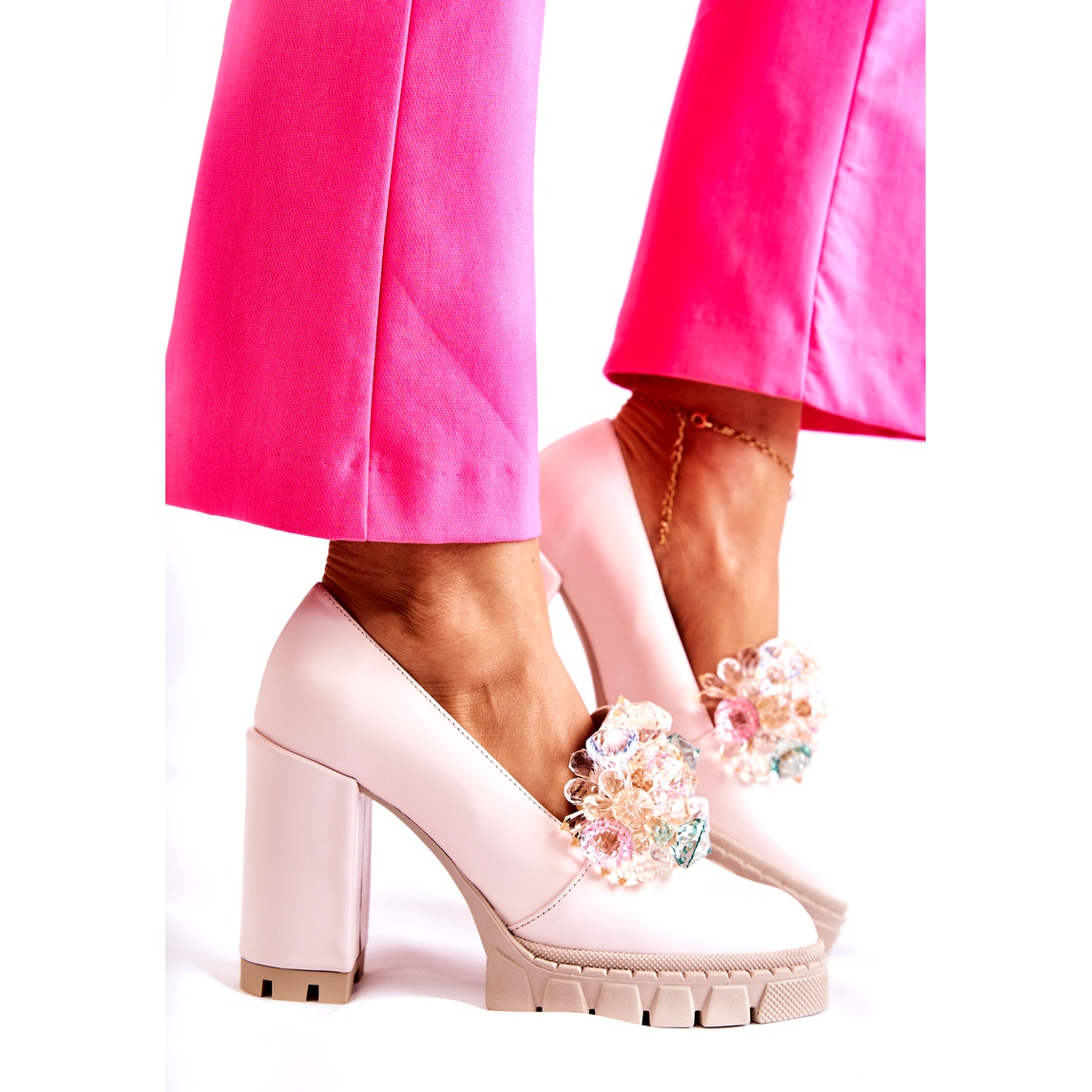 På framsidan av skorna finns en smakfull dekoration av imitationen av färgglada kristaller (strass), som tillför glans och elegans. En mjuk insats av naturligt läder och yttre material tillverkat av naturläder garanti komfort och hållbarhet. Pumparna har en rund näsa och införingsinsättning - lätt att använda och universella i stiliseringar.