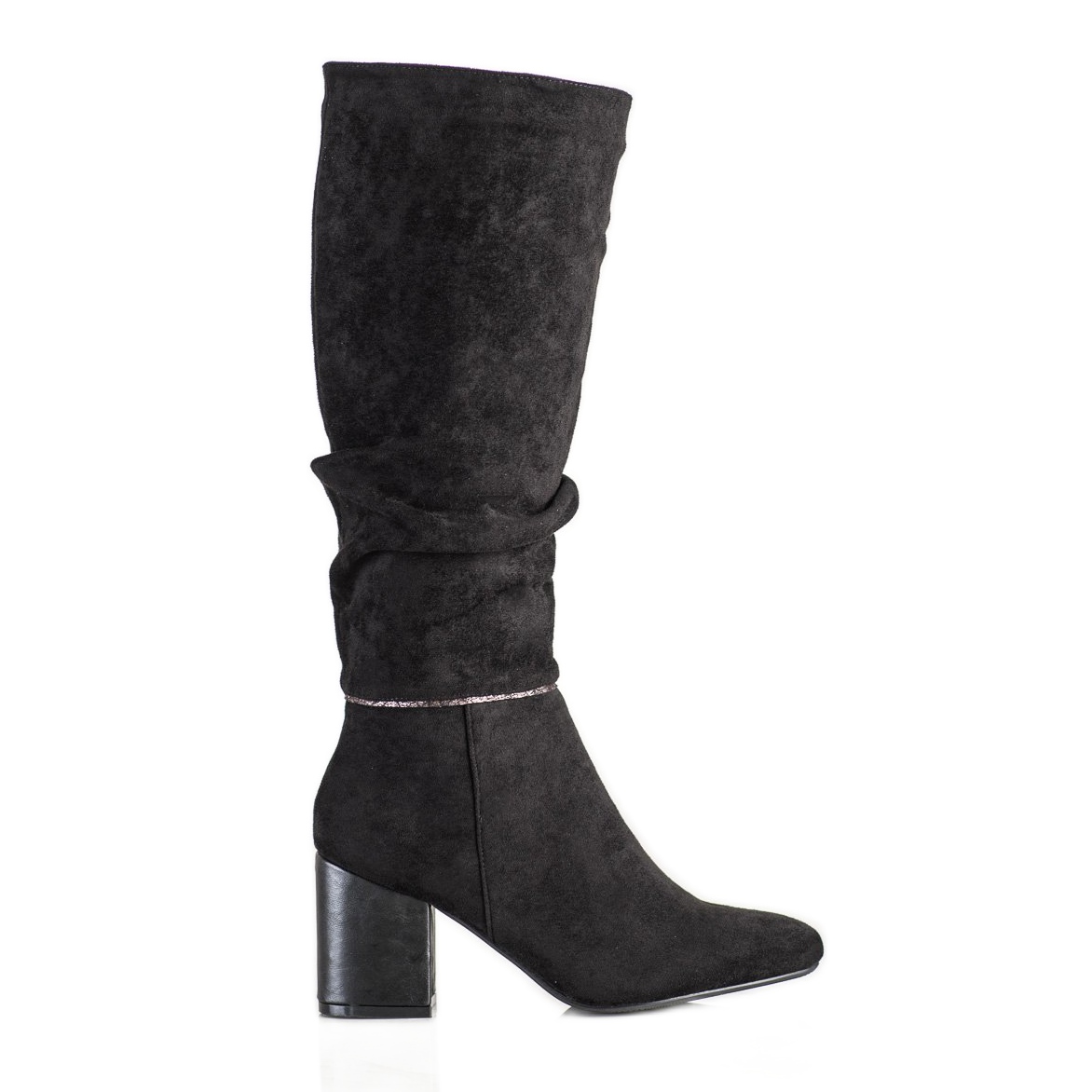Upptäck elegans och komfort med högklackade stövlar från M.Daszyński. Dessa svarta stövlar är det perfekta valet för kvinnor som letar efter snygga skor för höst och vinter. Tillverkade av högkvalitativt ekologiskt läder som imiterar mocka, de ser inte bara klassiska utan också moderna ut, vilket gör dem till ett mångsidigt garderobsobjekt.