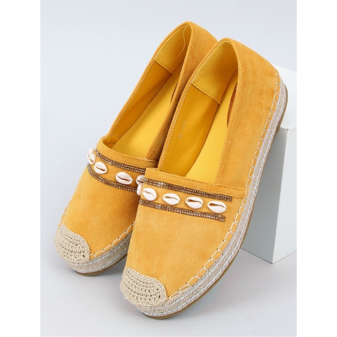 Upptäck sommarens glädje med espadrilles med skal honung 6771 gul från Inello! Dessa eleganta kvinnors espadrilles på en hög sula är det perfekta valet för varje kvinna som vill kombinera komfort med ett fashionabelt utseende.
