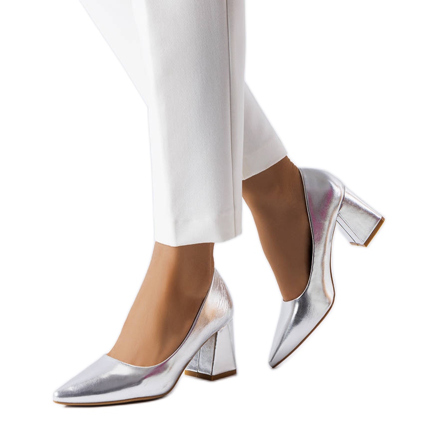 Lär känna de silverfärgade Fanchon högklackade pumps som kommer att ge glans till varje styling! Dessa eleganta skor, gjorda av högkvalitativt eko-läder, kännetecknas av en spetsig tå, som optiskt förlänger benen och ger dem elegans. Ställda på en stabil 7 cm hög blockklack, garanterar de komfort att bära hela dagen, oavsett tillfälle.