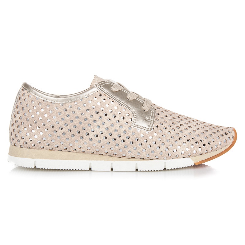 Sneakersna är gjorda av ekologiskt läder av hög kvalitet, och deras genombrutna mönster ger dem originalitet och lätthet. Färgerna – en harmonisk kombination av gult, guld, brunt och beige – gör att de matchar många olika outfits. Insidan av skorna är fodrad med mjukt tyg, vilket säkerställer komfort även när de bärs under långa perioder.