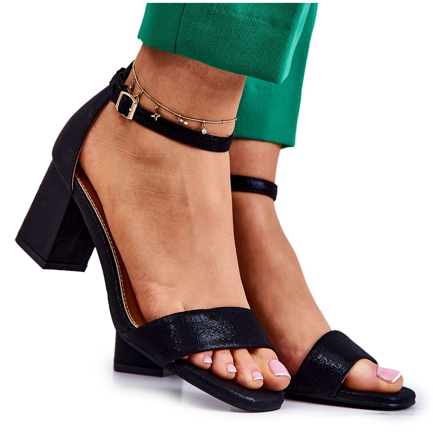 Eleganta kvinnors sandaler gjorda av glänsande tyg som perfekt kombinerar stil och komfort. En stabil, bred stolpe (ca 7 cm) ger ett visst steg, och den mjuka ekologiska läderinsatsen ger komfort även under längre bär. Modellen har en förstyvad klack, en öppen näsa och en bult med ett spänne fäst runt vristen - perfekt för bröllop, fester och sommarutflykter, de smälter bra med både eleganta klänningar och byxor.
